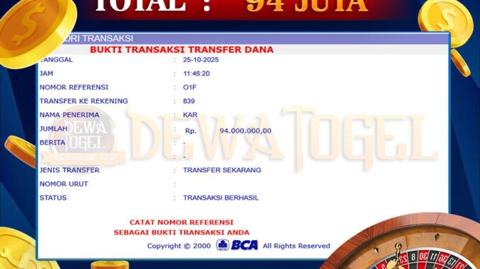 DEWATOGEL mengucapkan selamat kepada user id : RFW*** yang telah berhasil mendapatkan jackpot pada permainan LIVE CASINO DI ROULETTE. Kemenangan sebesar Rp 94.000.000,-. telah dibayarkan LUNAS oleh pihak dewatogel kepada pemilik user id setelah yang bersangkutan mengisi formulir withdraw. Proses pencairan dana berlangsung sangat cepat hanya dalam waktu 5-10 menit sudah berada dalam rekening pemilik user id. Bukti transfer yang dapat anda lihat adalah bukti SAH / VALID yang langsung di dapatkan melalui bukti transaksi dari Bank yang digunakan untuk pengiriman dana pada rekening pemilik user id. Terima kasih kami sampaikan kepada para pengguna setia DEWATOGEL yang telah menggunakan situs kami, sebagai Bandar Terpercaya yang pastinya membayar semua kemenangan member hingga lunas. Apakah DEWATOGEL PENIPU ? Reputasi “DEWATOGEL TERPERCAYA” sudah sangat melekat. puluhan hingga ratusan ribu pengguna setia DEWATOGEL tetap menggunakan situs terbesar dan terbaik di Indonesia ini. Hapus rasa was-was dan khawatir anda, kemenangan anda berapapun PASTI dibayarkan hingga lunas.